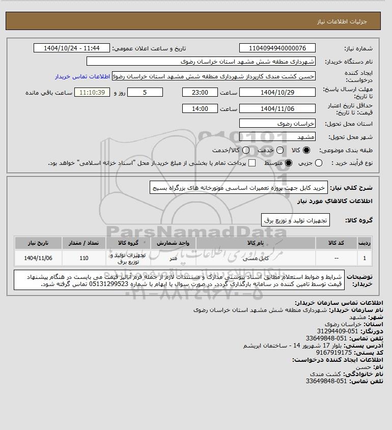 استعلام خرید کابل جهت پروژه تعمیرات اساسی موتورخانه های بزرگراه بسیج, استعلام خرید کابل جهت پروژه تعمیرات اساسی موتورخانه های بزرگراه بسیج