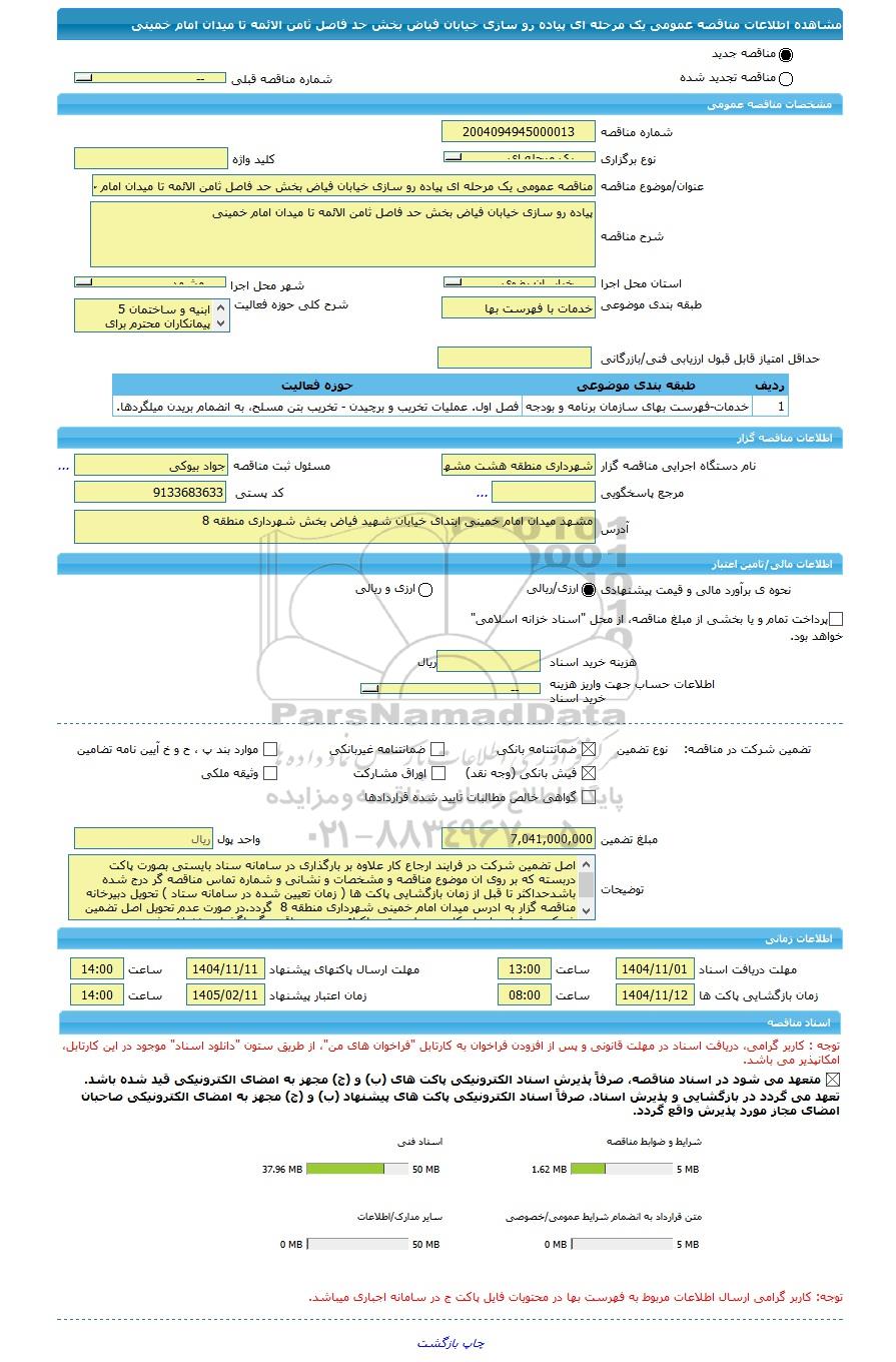 علاقه‌مندان می‌توانند جهت دریافت اسناد و اطلاعات تکمیلی، مناقصه مناقصه عمومی یک مرحله ای پیاده رو سازی خیابان فیاض بخش حد فاصل ثامن الائمه تا میدان امام خمینی با سامانه مناقصات و مزایدات ایران پارس‌نماد داده ها 88349670 تماس حاصل نمایند.