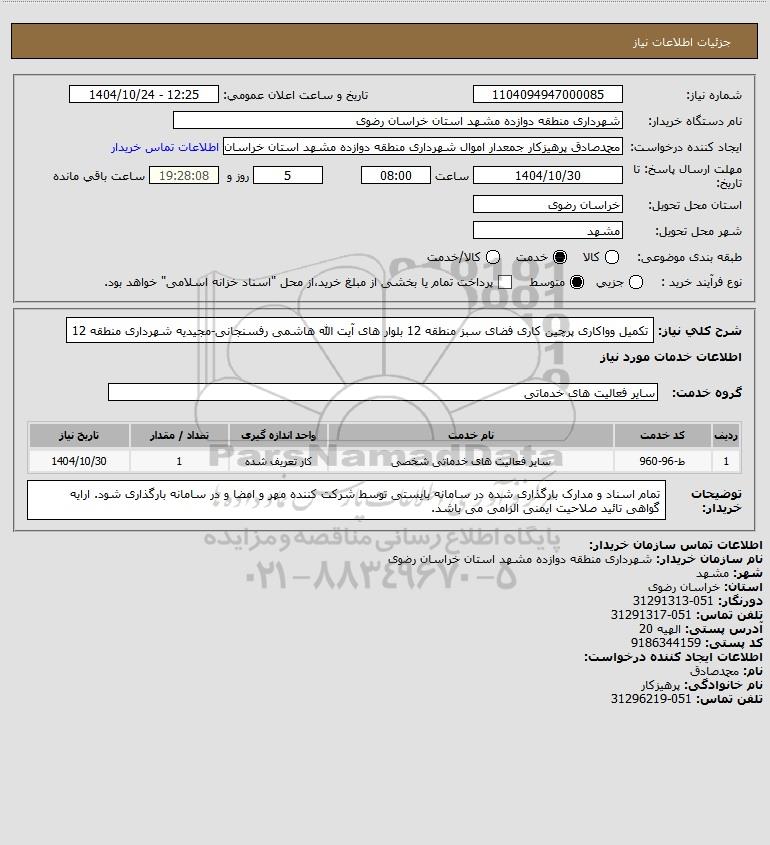 نام سازمان خریدار: شهرداری منطقه دوازده مشهد استان خراسان رضوی