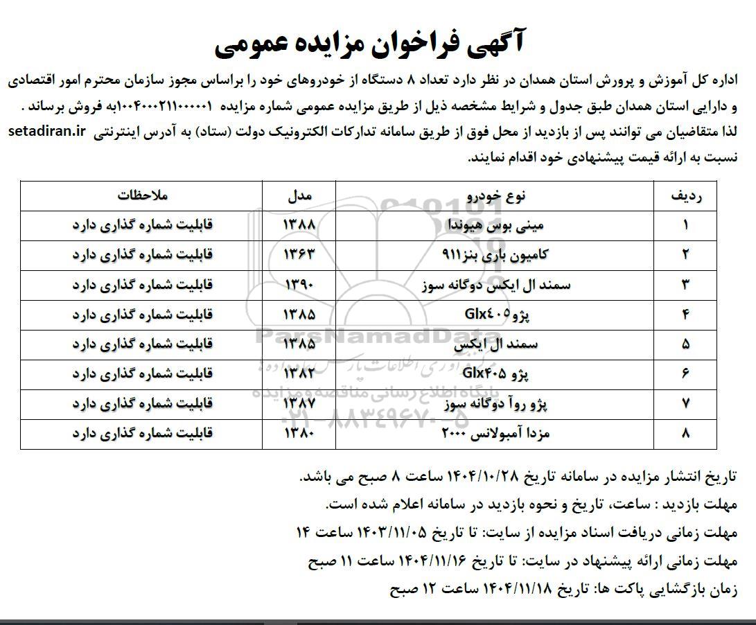 اداره کل آموزش و پرورش استان همدان در نظر دارد تعداد 8 دستگاه از خودروهای خود را بر اساس مجوز سازمان محترم امور اقتصادی و دارایی استان همدان طبق جدول و شرایط مشخصه ذیل از طریق مزایده عمومی شماره مزایده 1004000211000001 به فروش برساند .