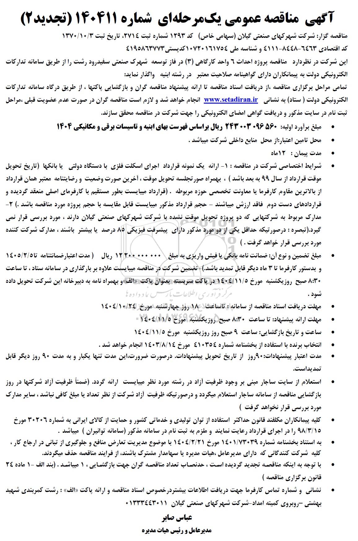 این شرکت در نظر دارد مناقصه پروژه احداث 6 واحد کارگاهی (3) در فاز توسعه شهرک صنعتی سفیدرود رشت را از طریق سامانه تدارکات الکترونیکی دولت به پیمانکاران دارای گواهینامه صلاحیت معتبر در رشته ابنیه واگذار نماید . تمامی مراحل برگزاری مناقصه از دریافت اسناد مناقصه تا ارائه پیشنهاد مناقصه گران و بازگشایی پاکتها ، از طریق درگاه سامانه تدارکات الکترونیکی دولت (ستاد) ایران انجام خواهد شد و لازم است مناقصه گران در صورت عدم عضویت قبلی ، مراحل ثبت نام در سایت مذکور و دریافت گواهی امضای الکترونیکی را جهت شرکت در مناقصه محقق سازند.