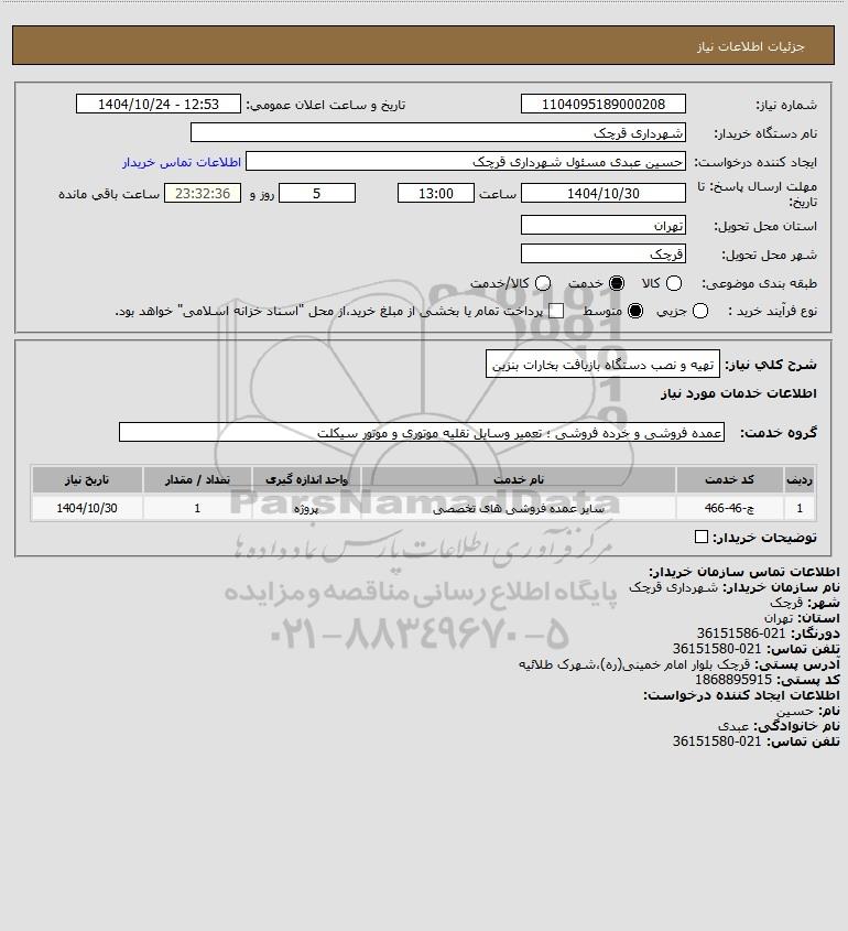 شرح کلی نیاز: تهیه و نصب دستگاه بازیافت بخارات بنزین