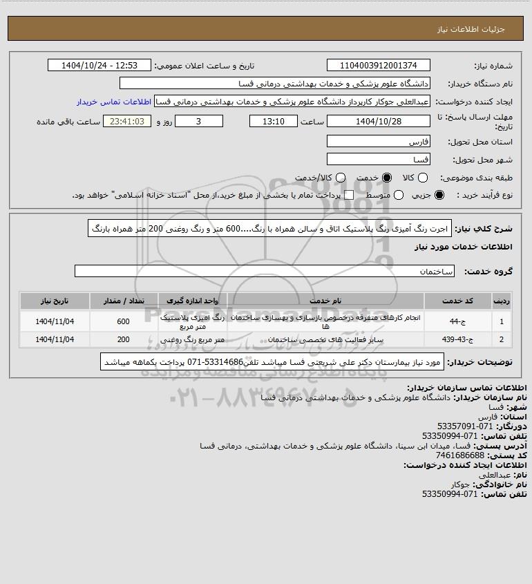 شرح کلی نیاز: اجرت رنگ آمیزی رنگ پلاستیک اتاق و سالن همراه با رنگ....600 متر و رنگ روغنی 200 متر همراه بارنگ