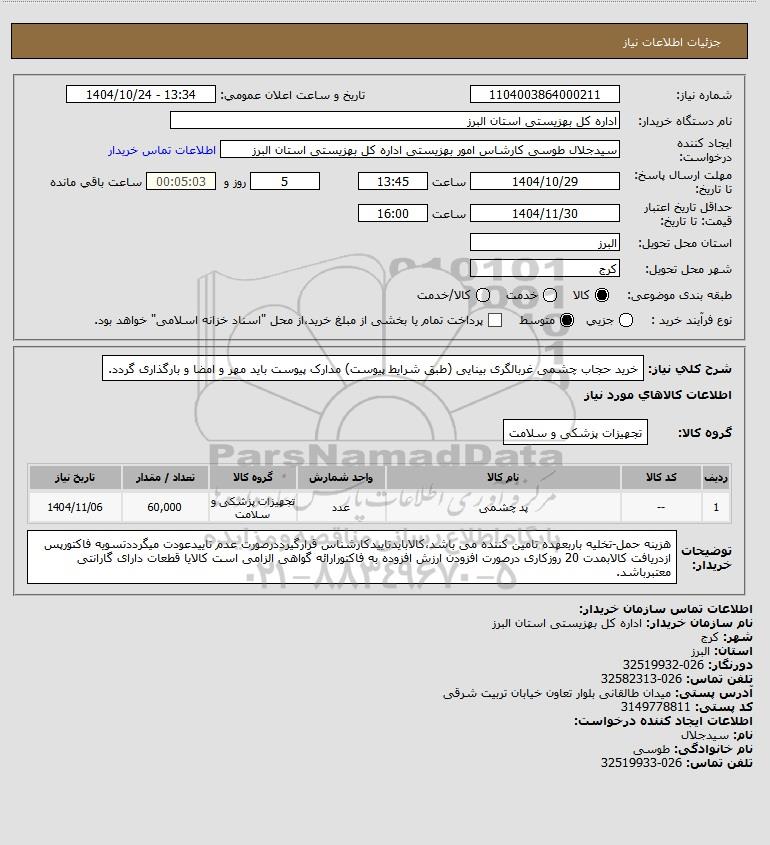 شرح کلی نیاز: خرید حجاب چشمی غربالگری بینایی (طبق شرایط پیوست) مدارک پیوست باید مهر و امضا و بارگذاری گردد.
