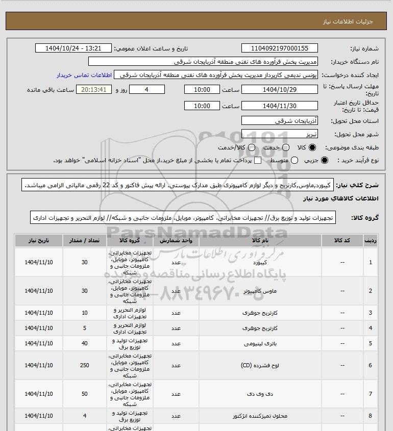 | 1 | -- | کیبورد | عدد | تجهیزات مخابراتی، کامپیوتر، موبایل، ملزومات جانبی و شبکه | 30 | 1404/11/10 |
