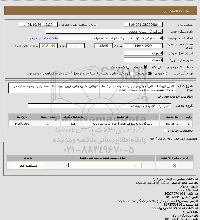 شرح کلی نیاز: تامین نیروی انسانی، خودرو و تجهیزات جهت انجام خدمات گازبانی، کنتورخوانی، توزیع صورتحساب مشترکین، وصول مطالبات و خدمات عمومی در سطح شهرستان کاشان