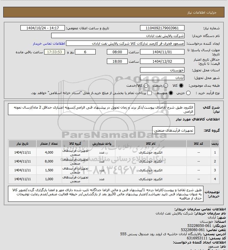 | 4 | -- | الکترود جوشکاری | عدد | تجهیزات فرآیندهای صنعتی | 1,000 | 1404/11/11 |