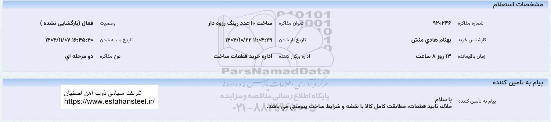 استعلام بها و موضوع استعلام استعلام ساخت 10 عدد رینگ رزوه دار به اطلاع کلیه شرکتها و افراد متخصص واجد شرایط میرساند، آگهی گذار در نظر دارد از طریق استعلام بها، نسبت به انتخاب و دریافت پیشنهادات اقدام نماید. این استعلام با کد آگهی ثبت شده در سامانه خبرگزاری پارس نماد : 10143351 منتشر شده است. مشخصات استعلام : تاریخ شروع استعلام: 1404/10/24 آخرین مهلت ارسال پیشنهاد قیمت : 1404/11/07 و محل اجرای پروژه : استان مناقصات استان اصفهان میباشد. استعلام قیمت مورد درخواست : استعلام ساخت 10 عدد رینگ رزوه دار با دستهبندیهای تخصصی و گروه های مرتبط : ساخت،نصب و تعمیرات صنایع فولاد, لوله و اتصالات, تجهیزات و ماشین آلات صنعتی, استعلام اطلاع رسانی میگردد.