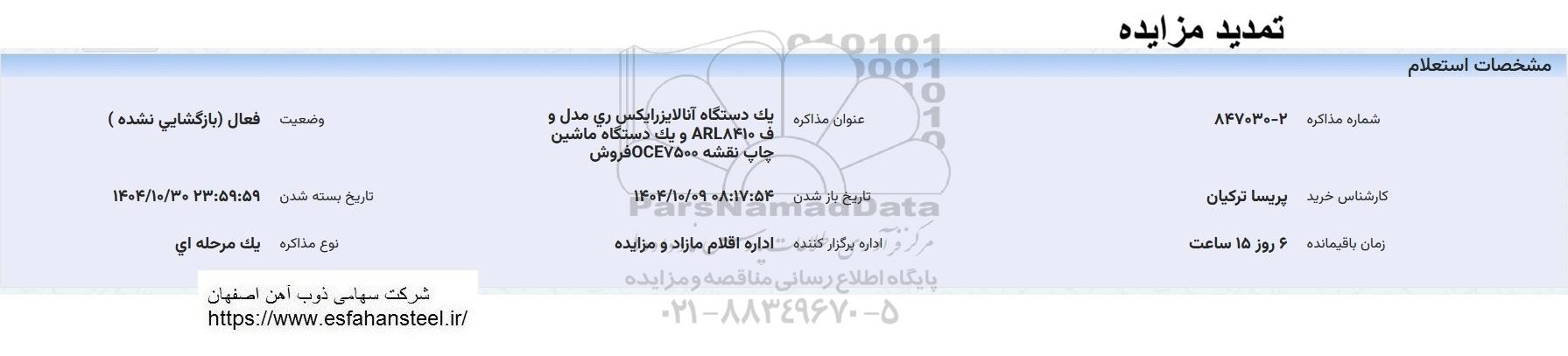 عنوان مذاکره: یک دستگاه آنالایزر ایکس ری مدل و ف ARL8410 و یک دستگاه ماشین چاپ نقشه OCE7500 فروش