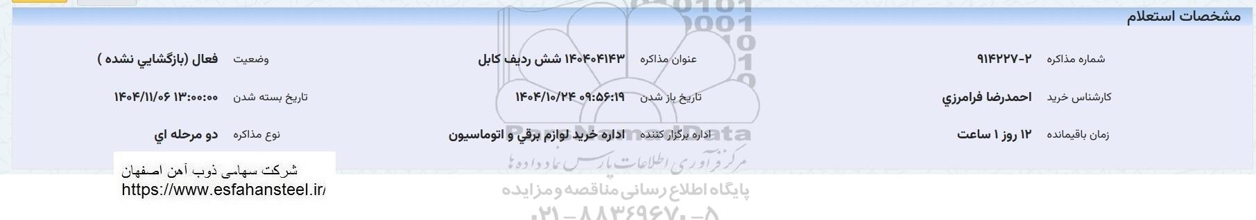 استعلام بها و موضوع استعلام استعلام شش ردیف کابل به اطلاع کلیه شرکتها و افراد متخصص واجد شرایط میرساند، آگهی گذار در نظر دارد از طریق استعلام بها، نسبت به انتخاب و دریافت پیشنهادات اقدام نماید. این استعلام با کد آگهی ثبت شده در سامانه خبرگزاری پارس نماد : 10143482 منتشر شده است. مشخصات استعلام : تاریخ شروع استعلام: 1404/10/24 آخرین مهلت ارسال پیشنهاد قیمت : 1404/11/06 و محل اجرای پروژه : استان مناقصات استان اصفهان میباشد. استعلام قیمت مورد درخواست : استعلام شش ردیف کابل با دستهبندیهای تخصصی و گروه های مرتبط : سیم و کابل, تجهیزات برق و الکترونیک, استعلام اطلاع رسانی میگردد.