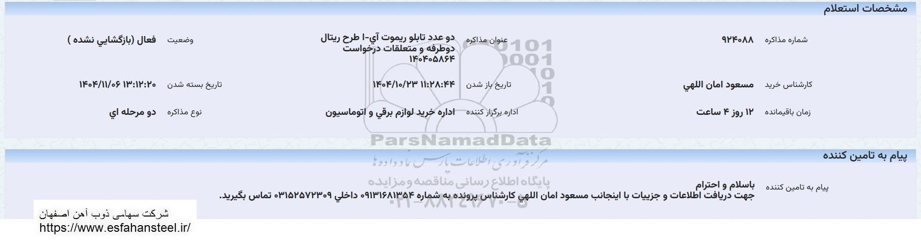 عنوان مذاکره: دو عدد تابلو ریموت آی - ا طرح ریتال دو طرفه و متعلقات درخواست 140405864