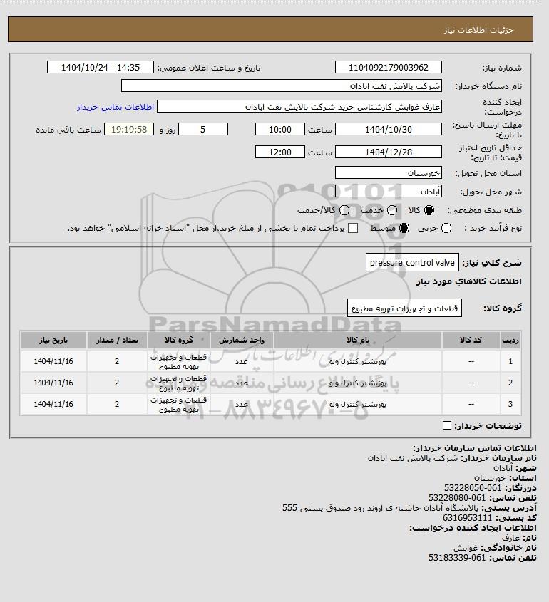 استعلام بها و موضوع استعلام استعلام pressure control valve به اطلاع کلیه شرکتها و افراد متخصص واجد شرایط میرساند، آگهی گذار در نظر دارد از طریق استعلام بها، نسبت به انتخاب و دریافت پیشنهادات اقدام نماید. این استعلام با کد آگهی ثبت شده در سامانه خبرگزاری پارس نماد : 10143544 منتشر شده است. مشخصات استعلام : تاریخ شروع استعلام: 1404/10/24 آخرین مهلت ارسال پیشنهاد قیمت : 1404/10/30 و محل اجرای پروژه : استان مناقصات استان خوزستان میباشد. استعلام قیمت مورد درخواست : استعلام pressure control valve با دستهبندیهای تخصصی و گروه های مرتبط : ابزار دقیق, تاسیسات ساختمانی, شیرآلات, تجهیزات نفت و گاز, استعلام اطلاع رسانی میگردد.