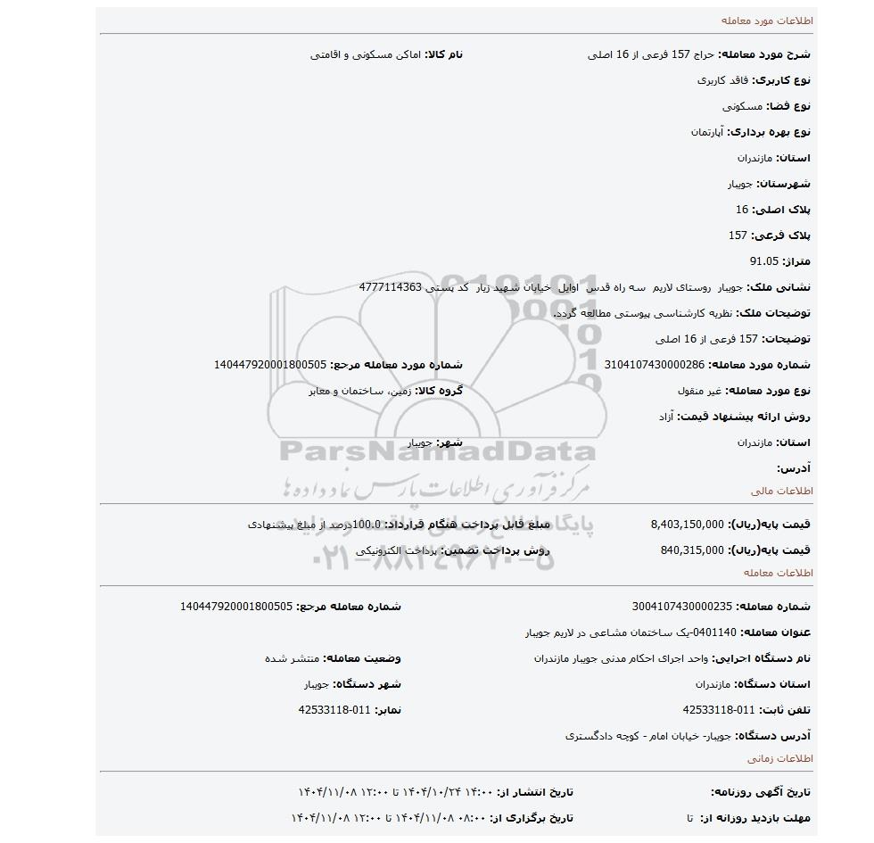 | عنوان معامله: 0401140-یک ساختمان مشاعی در لاریم جویبار | ||