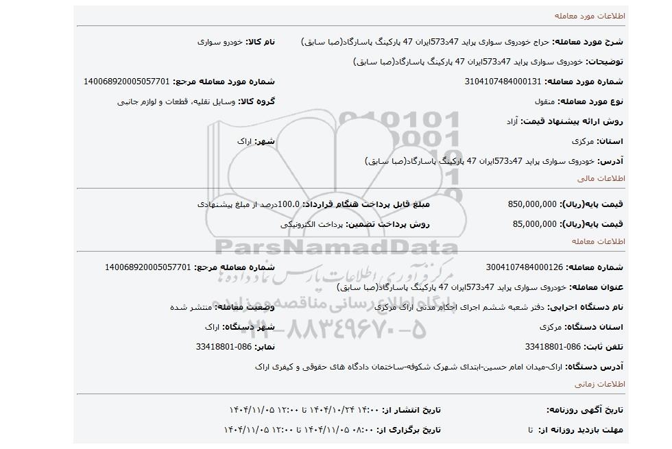 مزایده عمومی مزایده خودروی سواری پراید 47د573ایران 47 پارکینگ پاسارگاد(صبا سابق) برگزار میگردد. از کلیه افراد متخصص و شرکت‌های واجد شرایط دعوت به عمل می‌آید تا در این مزایده با کد خبرگزاری پارس نماد : 10143642 شرکت نمایند تاریخ شروع مزایده : 1404/10/24 مهلت شرکت در مزایده: تا پایان روز 1404/11/05 مکان برگزاری اموال واگذاری استان‌های مزایدات استان مرکزی و دسته‌بندی‌های مربوط به این حراجی انواع خودرو سبک میباشد.