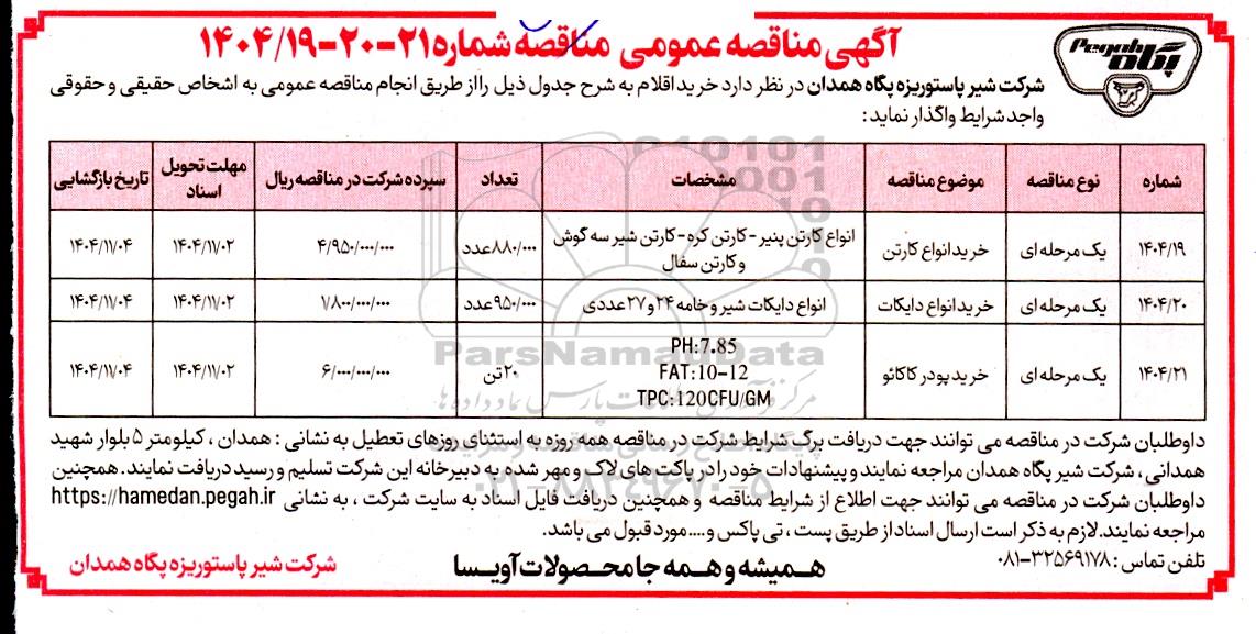 شرکت شیر پاستوریزه پگاه همدان در نظر دارد خرید اقلام مورد نیاز به شرح جدول ذیل را از طریق انجام مناقصه عمومی به اشخاص حقیقی و حقوقی واجد شرایط واگذار نماید: