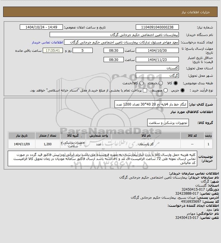 1 -- گاز پانسمان عدد تجهیزات پزشکی و سلامت 1,200 1404/11/09