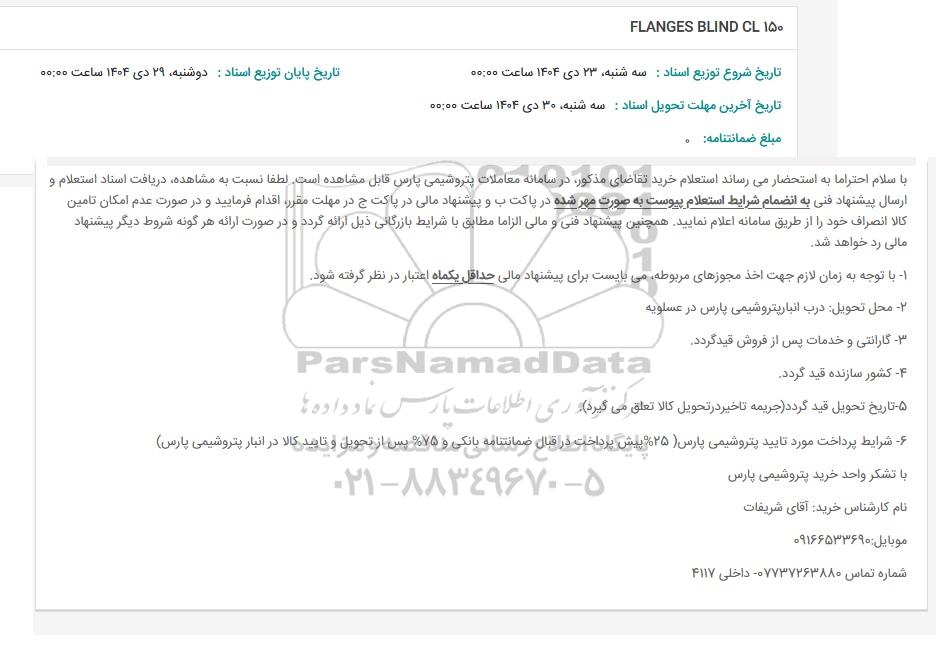 با سلام احتراما به استحضار می رساند استعلام خرید تقاضای مذکور در سامانه معاملات پتروشیمی پارس قابل مشاهده است. لطفا نسبت به مشاهده دریافت اسناد استعلام و ارسال پیشنهاد فنی به انضمام شرایط استعلام پیوست به صورت مهر شده در پاکت ب و پیشنهاد مالی در پاکت ج در مهلت مقرر اقدام فرمایید و در صورت عدم امکان تامین کالا انصراف خود را از طریق سامانه اعلام نمایید. همچنین پیشنهاد فنی و مالی الزاما مطابق با شرایط بازرگانی ذیل ارائه گردد و در صورت ارائه هر گونه شروط دیگر پیشنهاد مالی رد خواهد شد.