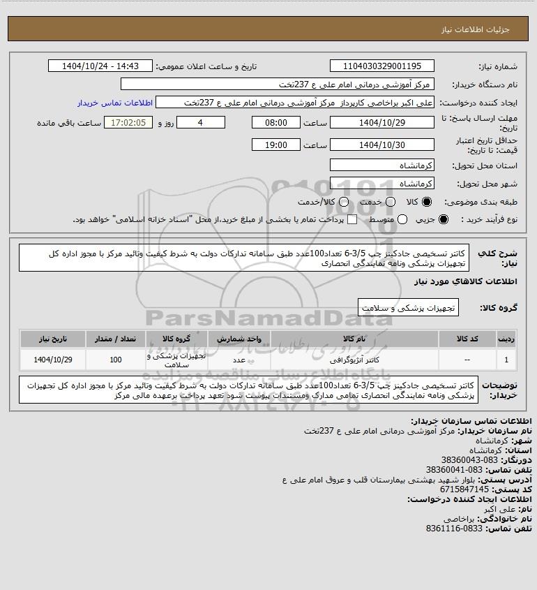 استعلام بها و موضوع استعلام استعلام کاتتر تسخیصی جادکینز چپ 3/5-6 تعداد100عدد طبق سامانه تدارکات دولت به شرط کیفیت وتائید مرکز با مجوز اداره کل تجهیزات پزشکی ونامه نمایندگی انحصاری به اطلاع کلیه شرکتها و افراد متخصص واجد شرایط میرساند، آگهی گذار در نظر دارد از طریق استعلام بها، نسبت به انتخاب و دریافت پیشنهادات اقدام نماید. این استعلام با کد آگهی ثبت شده در سامانه خبرگزاری پارس نماد : 10143756 منتشر شده است. مشخصات استعلام : تاریخ شروع استعلام: 1404/10/24 آخرین مهلت ارسال پیشنهاد قیمت : 1404/10/29 و محل اجرای پروژه : استان مناقصات استان کرمانشاه میباشد. استعلام قیمت مورد درخواست : استعلام کاتتر تسخیصی جادکینز چپ 3/5-6 تعداد100عدد طبق سامانه تدارکات دولت به شرط کیفیت وتائید مرکز با مجوز اداره کل تجهیزات پزشکی ونامه نمایندگی انحصاری با دستهبندیهای تخصصی و گروه های مرتبط : خدمات و تجهیزات آزمایشگاهی و پزشکی, استعلام اطلاع رسانی میگردد.