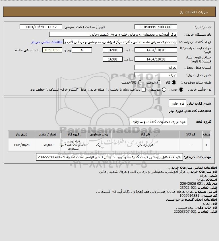 | 1 | -- | فرم پزشکی | برگ | مواد اولیه، محصولات کاغذی و سلولزی | 176,000 | 1404/10/28 |