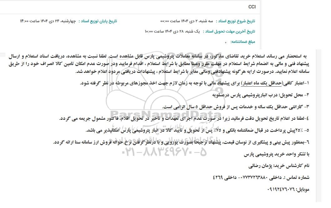 به استحضار میرساند استعلام خرید تقاضای مذکور در سامانه معاملات پتروشیمی پارس قابل مشاهده است. لطفا نسبت به مشاهده دریافت اسناد استعلام و ارسال پیشنهاد فنی و مالی به انضمام شرایط استعلام در مهلت مقرر و عینا مطابق با شرایط استعلام ، اقدام فرمایید و در صورت عدم امکان تامین کالا انصراف خود را از طریق سامانه اعلام نمایید. در صورت ارایه هر گونه پیشنها دفنی و مالی مغایر با شرایط استعلام ، پیشنهادات دریافتی مردود اعلام خواهد شد.
