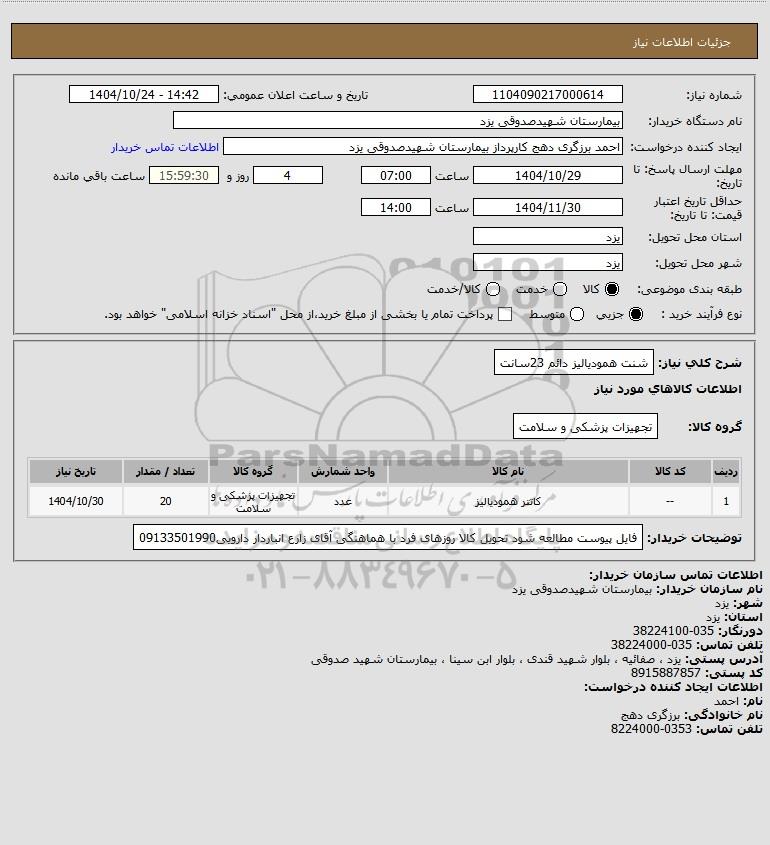 | 1 | -- | کاتتر همودیالیز | عدد | تجهیزات پزشکی و سلامت | 20 | 1404/10/30 |