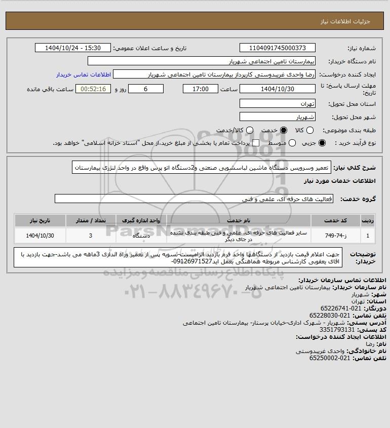 نام دستگاه خریدار:بیمارستان تامین اجتماعی شهریار