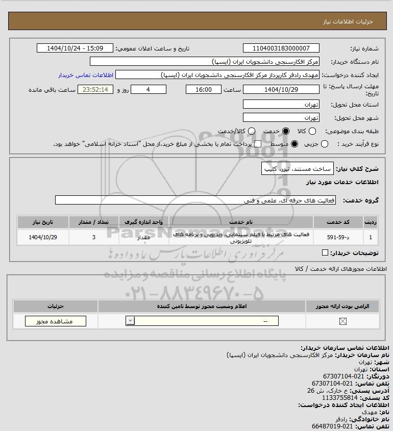 شرح کلی نیاز: ساخت مستند، تیزر، کلیپ