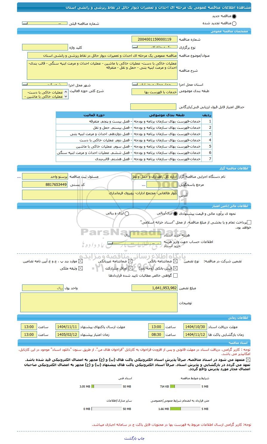 | عنوان/موضوع مناقصه | مناقصه عمومی یک مرحله ای احداث و تعمیرات دیوار حائل در نقاط ریزشی و رانشی استان | ||||||||||||||||||||||||||