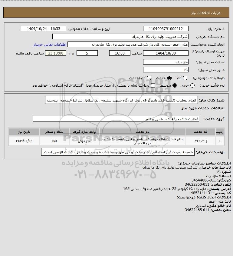 شرح کلی نیاز: انجام عملیات تفسیر فیلم رادیوگرافی بویلر نیروگاه شهید سلیمی نکا مطابق شرایط خصوصی پیوست