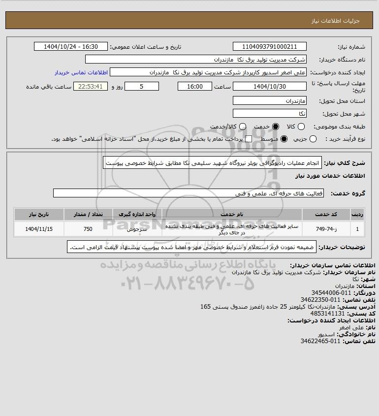 شرح کلی نیاز: انجام عملیات رادیوگرافی بویلر نیروگاه شهید سلیمی نکا مطابق شرایط خصوصی پیوست