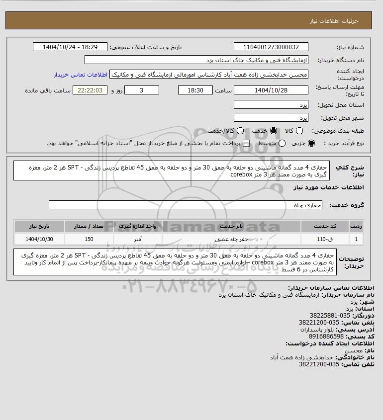 توضیحات خریدار:حفاری 4 عدد گمانه ماشینی دو حلقه به عمق 30 متر و دو حلقه به عمق 45 تقاطع پردیس زندگی - SPT هر 2 متر، مغزه گیری به صورت ممتد هر 3 متر corebox –لوازم ایمنی ومسئولیت هرگونه حوادث وبیمه بر عهده پیمانکار-پرداخت پس از اتمام کار وتایید کارشناس در 6 قسط