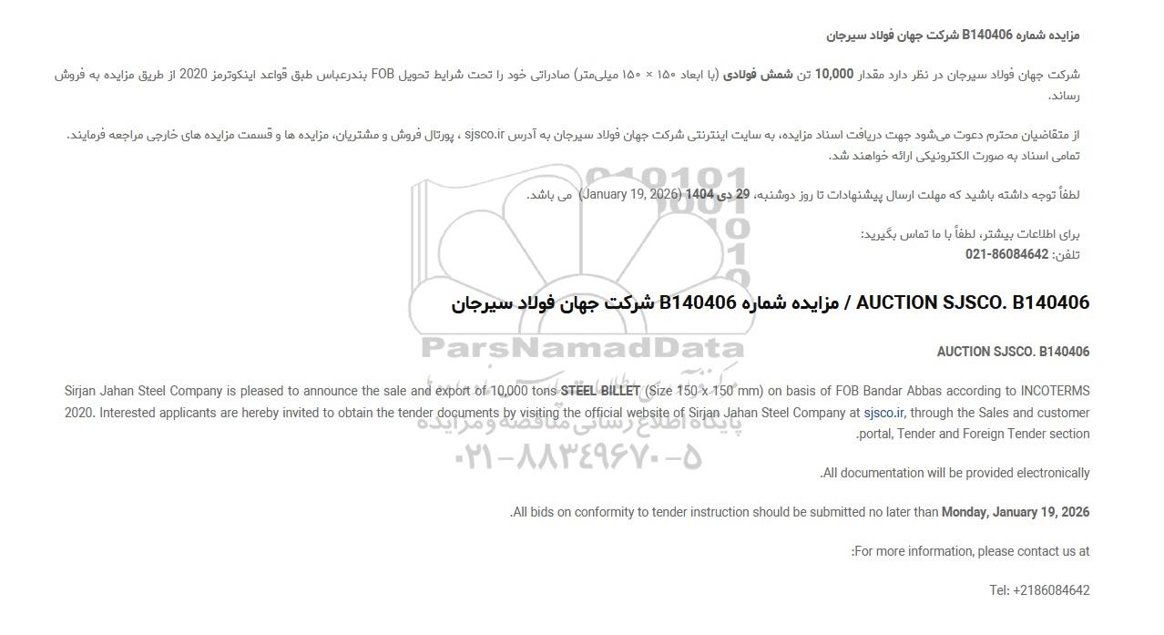 شرکت جهان فولاد سیرجان در نظر دارد مقدار 10.000 تن شمش فولادی (با ابعاد 150 × 150 میلیمتر) صادراتی خود را تحت شرایط تحویل FOB بندرعباس طبق قواعد اینکوترمز 2020 از طریق مزایده به فروش رساند.