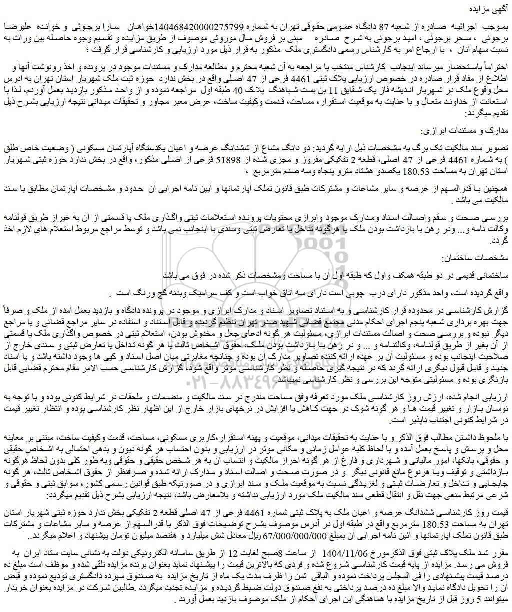 بموجب  اجرائیه  صادره از شعبه 87 دادگاه عمومی حقوقی تهران به شماره 140468420000275799خواهان   سارا برجوئی  و خوانده  علیرضا برجوئی  ، سحر برجوئی ، امید برجوئی به شرح  صادره     مبنی بر فروش مال موروثی موصوف از طریق مزایده و تقسیم وجوه حاصله بین وراث به نسبت سهام آنان  ،  با ارجاع امر به کارشناس رسمی دادگستری ملک  مذکور به قرار ذیل مورد ارزیابی و کارشناسی قرار گرفت ؛