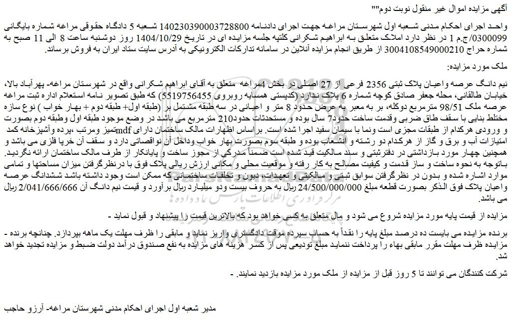 واحد اجرای احکام مدنی شعبه اول شهرستان مراغه جهت اجرای دادنامه 140230390003728800 شعبه 5 دادگاه حقوقی مراغه شماره بایگانی 0300099/ج.م 1 در نظر دارد املاک متعلق به ابراهیم شکرانی کلتپه جلسه مزایده ای در تاریخ 1404/10/29 روز دوشنبه ساعت 8 الی 11 صبح به شماره حراج 3004108549000210 از طریق انجام مزایده آنلاین در سامانه تدارکات الکترونیکی به آدرس سایت ستاد ایران به فروش برساند.