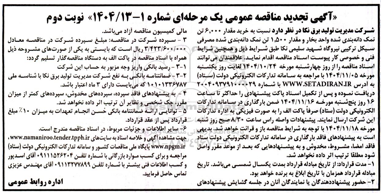 شرکت مدیریت تولید برق نکا در نظر دارد نسبت به خرید مقدار 6000 تن نمک دانه بندی شده واحد بخار و مقدار 1500 تن نمک دانه بندی شده مصرفی سیلک ترکیبی نیروگاه شهید سلیمی نکا طبق شرایط ذیل و همچنین شرایط فنی و خصوصی کار پیوست اسناد مناقصه اقدام نماید. علاقه مندان میتوانند اسناد مناقصه را از روز چهارشنبه مورخه 1404.10.24 لغایت روز یکشنبه مورخه 1404.11.05 با مراجعه به سامانه تدارکات الکترونیکی دولت (ستاد) به آدرس ستاد ایران  با شماره 2004093791000029 دریافت نموده و پس از تکمیل اسناد پاکت پیشنهادی را حداکثر تا ساعت 16 روز پنجشنبه مورخه 1404.11.16 ضمن بارگذاری در سامانه تدارکات الکترونیکی دولت (ستاد) صرفا پاکت الف را به صورت فیزیکی به اداره تدارکات این شرکت ارسال نمایند. پیشنهادات واصله راس ساعت 8:30 صبح روز شنبه مورخه 1404.11.18 با توجه به شرایط مناقصه باز و قرائت خواهد شد. بدیهی است به پیشنهادهای فاقد بارگذاری در سامانه تدارکات الکترونیکی دولت ستاد فاقد امضاء مشروط، مخدوش و به پیشنهادهایی که بعد از موعد مقرر واصل شود مطلقا ترتیب اثر داده نخواهد شد.
