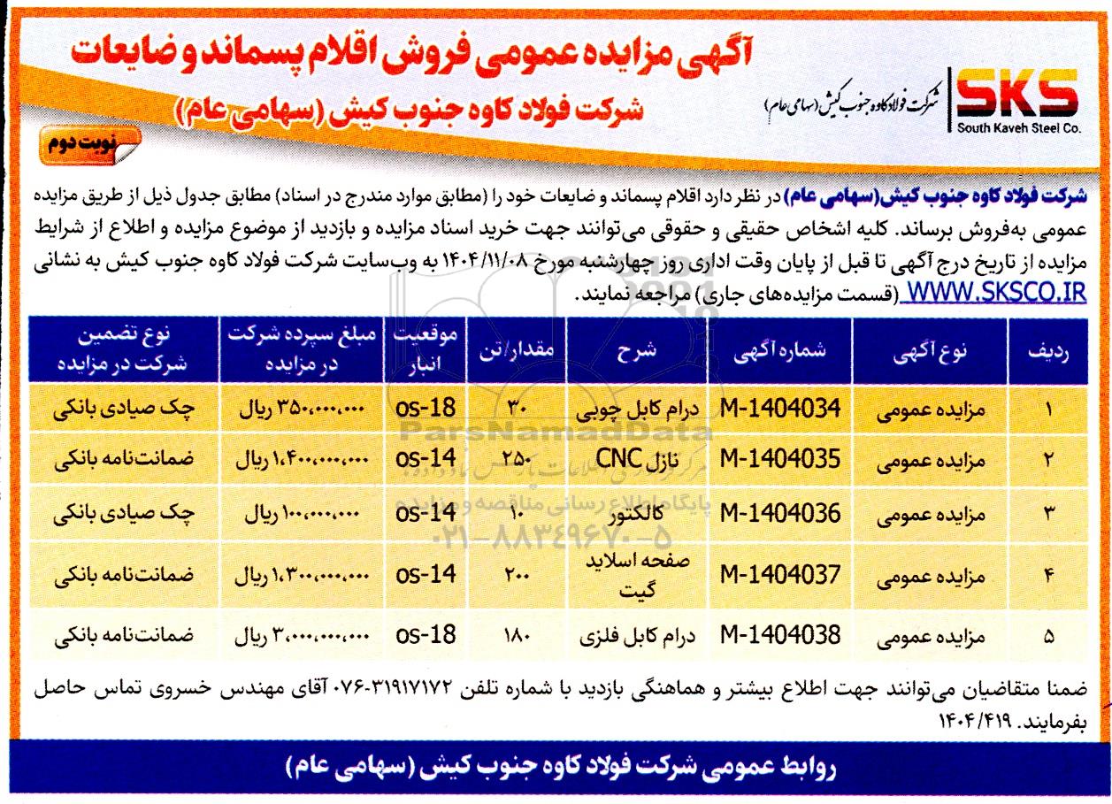 شرکت فولاد کاوه جنوب کیش (سهامی عام در نظر دارد اقلام پسماند و ضایعات خود را مطابق موارد مندرج در اسناد مطابق جدول ذیل از طریق مزایده عمومی به فروش برساند کلیه اشخاص حقیقی و حقوقی میتوانند جهت خرید اسناد مزایده و بازدید از موضوع مزایده و اطلاع از شرایط مزایده از تاریخ درج آگهی تا قبل از پایان وقت اداری روز چهارشنبه مورخ 1404.11.8 به وب سایت شرکت فولاد کاوه جنوب کیش به نشانی WWW.SKSCO.IR (قسمت مزایده های جاری) مراجعه نمایند.