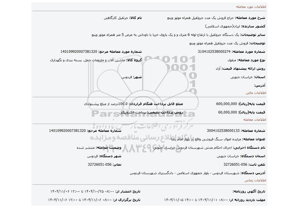 | شماره مورد معامله: 3104102538000274 | شماره مورد معامله مرجع: 140109920007381320 | |