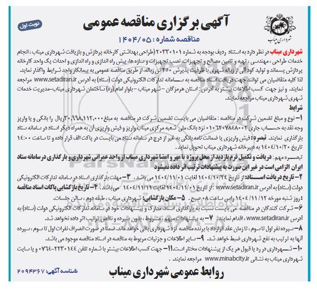 شهرداری میناب در نظر دارد به استناد ردیف بودجه به شماره 20330101 طراحی بهداشتی کارخانه پردازش و بازیافت شهرداری میناب، انجام خدمات طراحی، مهندسی ، تهیه و تامین مصالح و تجهیزات ، نصب تجهیزات و سازه ها ، پیش راه اندازی و راه اندازی و احداث یک واحد کارخانه پردازش پسماند و تولید کود آلی از زباله شهری با ظرفیت پذیرش 250 تن زباله از طریق مناقصه عمومی به پیمانکار واجد شرایط واگذار نماید.