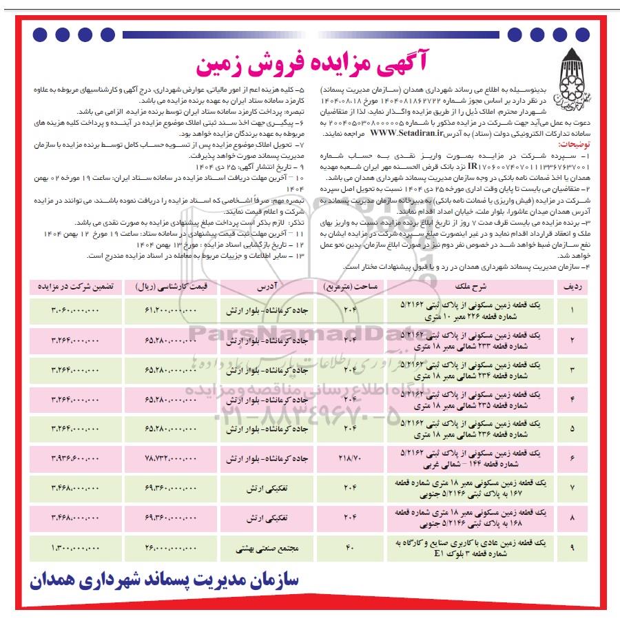 | 1 | یک قطعه زمین مسکونی از پلاک ثبتی 5/2162 شماره قطعه 226 معبر 10 متری | 204 | جاده کرمانشاه- بلوار ارتش | 61.200.000.000 | 3.060.000.000 |