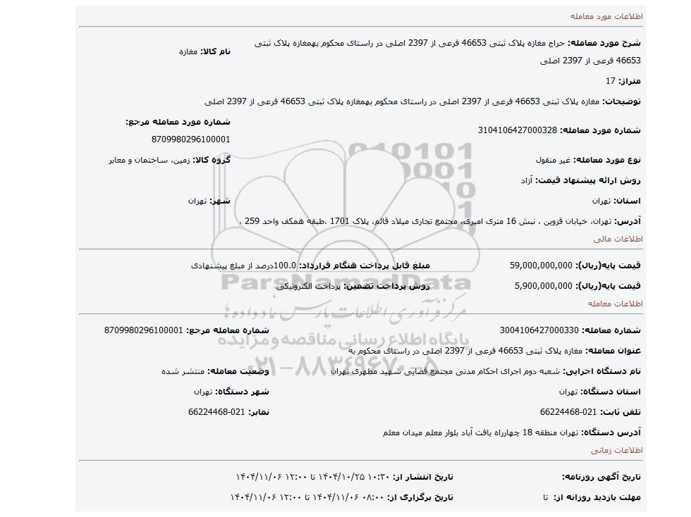 عنوان معامله: مغازه پلاک ثبتی 46653 فرعی از 2397 اصلی در راستای محکوم به