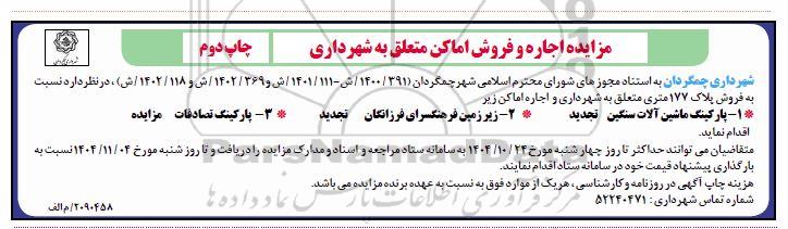 شهرداری چمگردان به استناد مجوزهای شورای محترم اسلامی شهر چمگردان (391 / 1400/ ش و 111 / 1401 / ش و 1402/369 و 1401/118 / ش