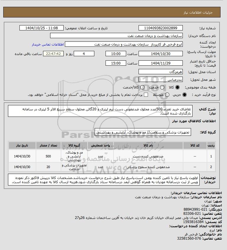شرح کلی نیاز: تقاضای خرید تعداد 500عدد محلول ضدعفونی دست نیم لیتری و 20گالن محلول سطح سریع الاثر 5 لیتری در سامانه بارگذاری شده است.