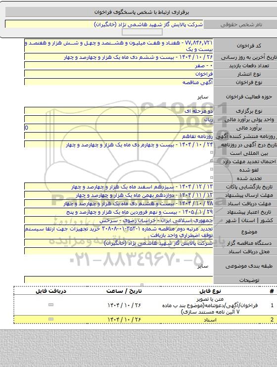تجدید مرتبه دوم مناقصه شماره ۱-۳۵۳-۰۱-۳۰۸۰۸ خرید تجهیزات جهت ارتقا سیستم توقف اضطراری واحد بازیافت