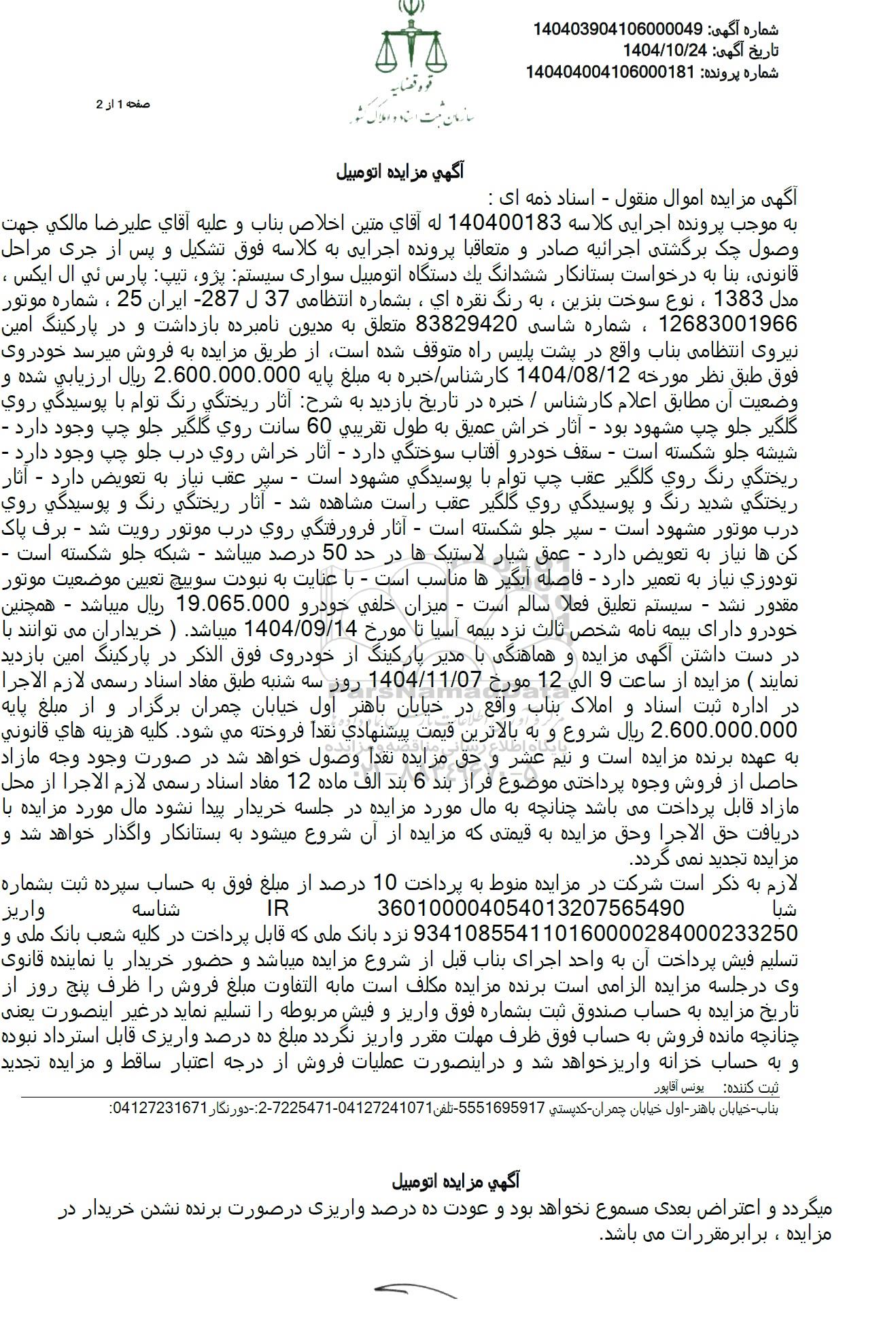 به موجب پرونده اجرایی کلاسه 140400183 له آقای متین اخلاص بناب و علیه آقای علیرضا مالكی جهت وصول چک برگشتی اجرائیه صادر و متعاقبا پرونده اجرایی به کلاسه فوق تشکیل و پس از جری مراحل قانونی بنا به درخواست بستانکار ششدانگ یک دستگاه اتومبیل سواری سیستم پژو، تیپ پارس ئی ال ایكس ،مدل 1383 ، نوع سوخت بنزین ، به رنگ نقره ای ، بشماره انتظامی 37 ل 287 - ایران 25 ، شماره موتور 12683001966 ، شماره شاسی 83829420 متعلق به مدیون نامبرده بازداشت و در پارکینگ امین نیروی انتظامی بناب واقع در پشت پلیس راه متوقف شده است از طریق مزایده به فروش میرسد خودروی فوق طبق نظر مورخه 1404.08.12 کارشناس خبره به مبلغ پایه 2.600.000.000 ریال ارزیابی شده و وضعیت آن مطابق اعلام کارشناس . خبره در تاریخ بازدید به شرح آثار ریختگی رنگ توام با پوسیدگی روی گلگیر جلو چپ مشهود بود - آثار خراش عمیق به طول تقریبی 60 سانت روی گلگیر جلو چپ وجود دارد - شیشه جلو شکسته است - سقف خودرو آفتاب سوختگی دارد - آثار خراش روی درب جلو چپ وجود دارد - ریختگی رنگ روی گلگیر عقب چپ توام با پوسیدگی مشهود است - سپر عقب نیاز به تعویض دارد - آثار ریختگی شدید رنگ و پوسیدگی روی گلگیر عقب راست مشاهده شد - آثار ریختگی رنگ و پوسیدگی روی درب موتور مشهود است - سیر جلو شکسته است - آثار فرورفتگی روی درب موتور رویت شد - برف پاک كنها نیاز به تعویض دارد - عمق شیار لاستیک ها در حد 50 درصد میباشد - شبکه جلو شکسته است تو دوزی نیاز به تعمیر دارد - فاصله آبگیرها مناسب است - با عنایت به نبودت سوییچ تعیین موضعیت موتور مقدور نشد - سیستم تعلیق فعلا سالم است - میزان خلفی خودرو 19.065.000 ریال میباشد - همچنین خودرو دارای بیمه نامه شخص ثالث نزد بیمه آسیا تا مورخ 1404.09.14 میباشد. ) خریداران می توانند با در دست داشتن آگهی مزایده و هماهنگی با مدیر پارکینگ از خودروی فوق الذکر در پارکینگ امین بازدید نمایند ( مزایده از ساعت 9 الی 12 مورخ 1404.11.07 روز سه شنبه طبق مفاد اسناد رسمی لازم الاجرا در اداره ثبت اسناد و املاک بناب واقع در خیابان باهنر اول خیابان چمران برگزار و از مبلغ پایه 2.600.000.000 ریال شروع و به بالاترین قیمت پیشنهادی نقداً فروخته می شود. کلیه هزینه های قانونی به عهده برنده مزایده است و نیم عشر و حق مزایده نقداً وصول خواهد شد در صورت وجود وجه مازاد حاصل از فروش وجوه پرداختی موضوع فراز بند 6 بند الف ماده 12 مفاد اسناد رسمی لازم الاجرا از محل مازاد قابل پرداخت می باشد چنانچه به مال مورد مزایده در جلسه خریدار پیدا نشود مال مورد مزایده با دریافت حق الاجرا وحق مزایده به قیمتی که مزایده از آن شروع میشود به بستانکار واگذار خواهد شد