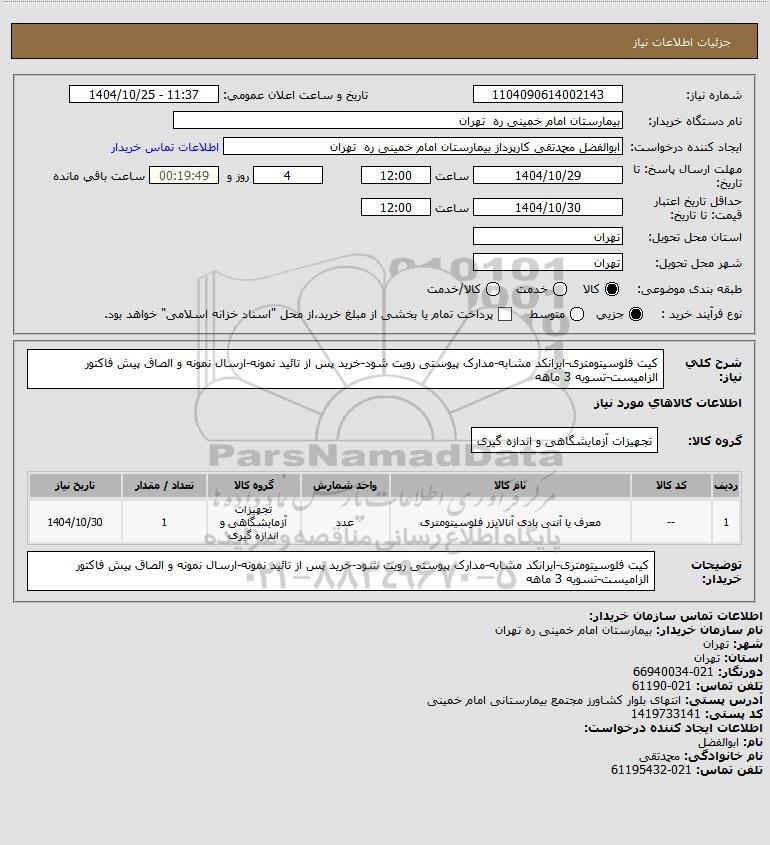 شرح کلی نیاز: کیت فلوسیتومتری-ایرانکد مشابه-مدارک پیوستی رویت شود-خرید پس از تائید نمونه-ارسال نمونه و الصاق پیش فاکتور الزامیست-تسویه 3 ماهه