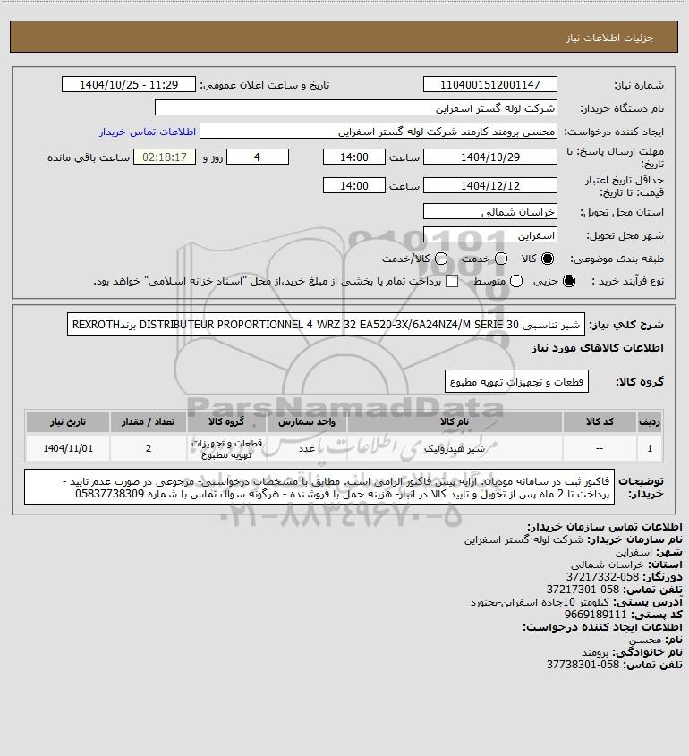 شرح کلی نیاز: شیر تناسبی DISTRIBUTEUR PROPORTIONNEL 4 WRZ 32 EA520-3X/6A24NZ4/M SERIE 30 برندREXROTH