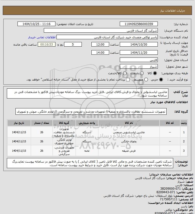 شرح کلی نیاز: ماشین لباسشوئی و یخچال و فرش.کالای ایرانی .فایل خرید پیوست .برگ سامانه مودیان.پیش فاکتور با مشخصات فنی در سامانه پیوست شود.