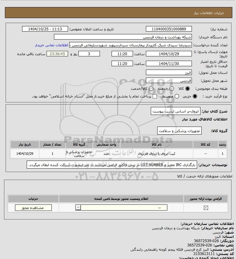 شرح کلی نیاز: ایروی-بر اساس لیست پیوست