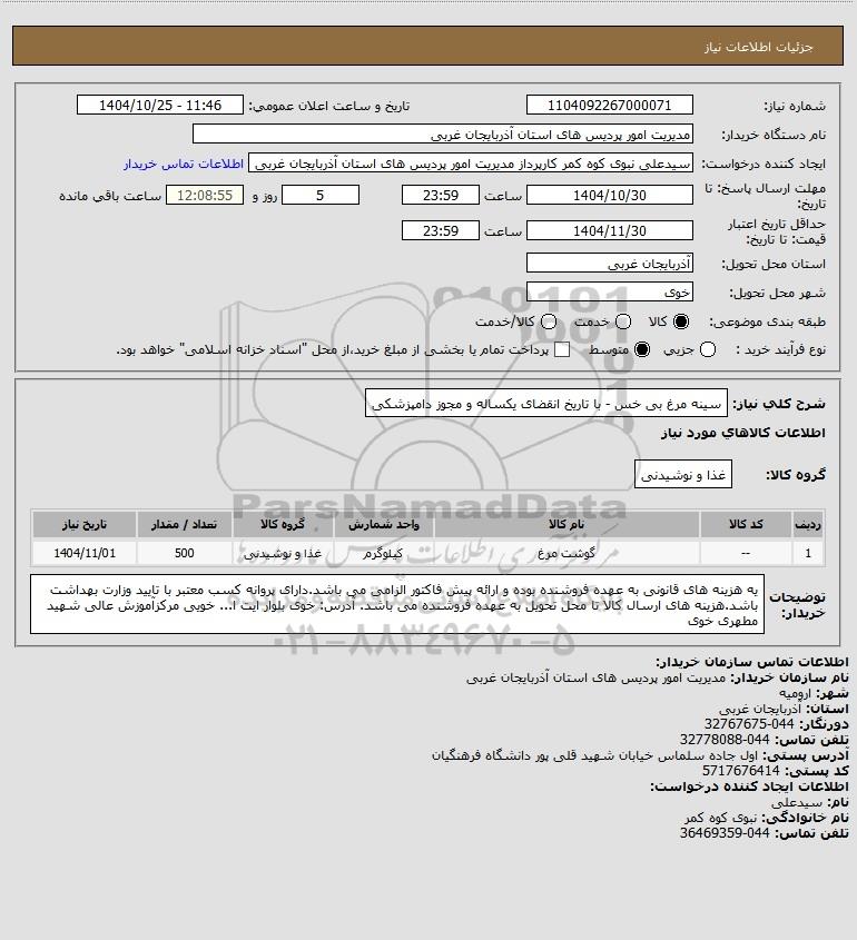 شرح کلی نیاز: سینه مرغ بی خس - با تاریخ انقضای یکساله و مجوز دامپزشکی