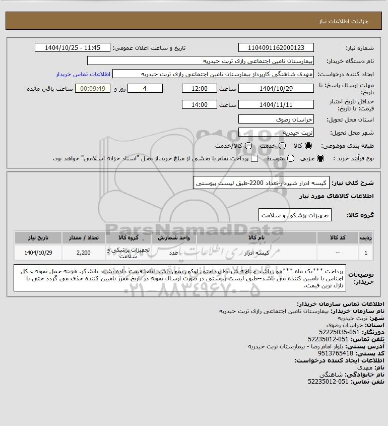 شرح کلی نیاز: کیسه ادرار شیردار-تعداد 2200-طبق لیست پیوستی
